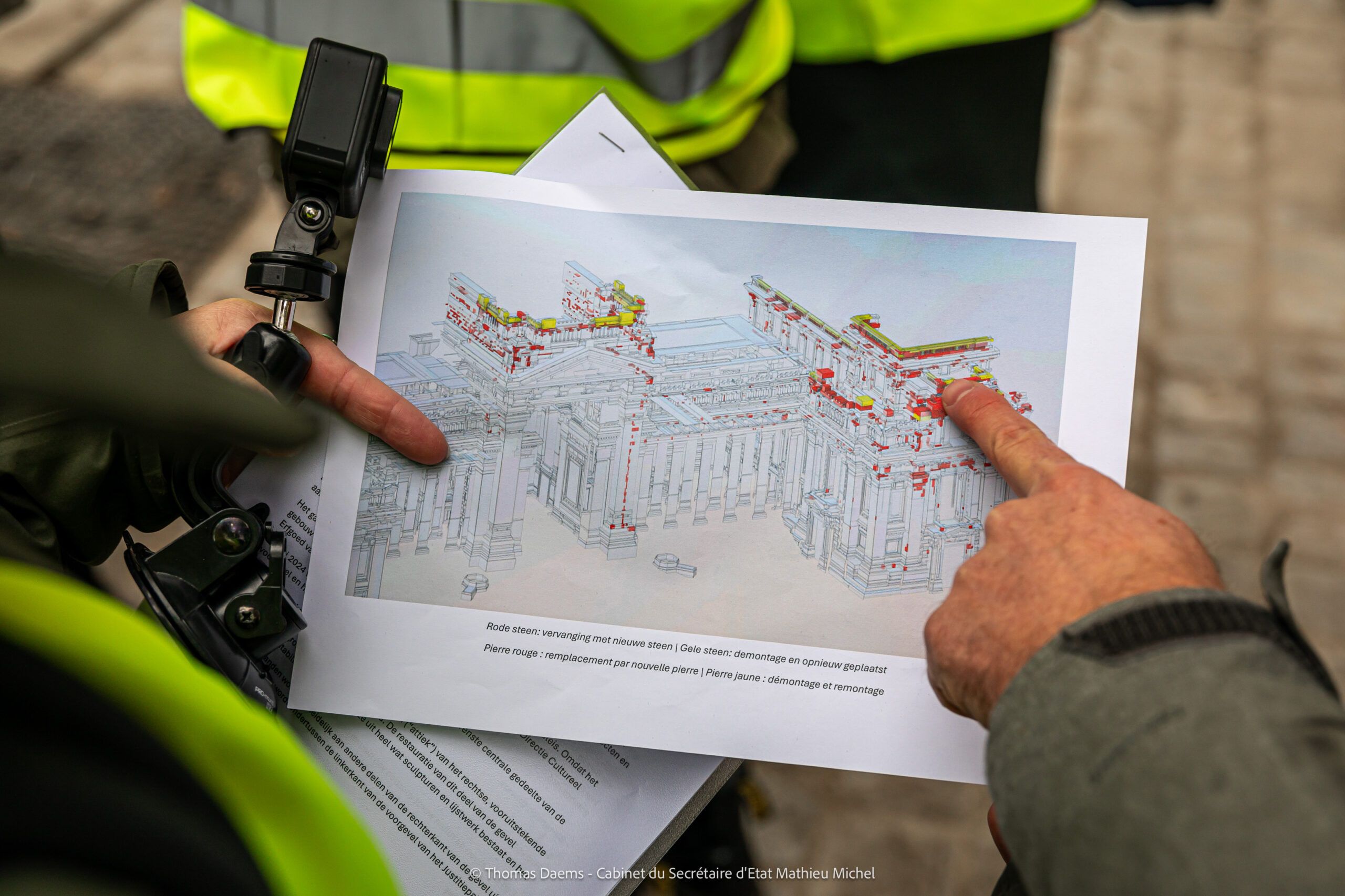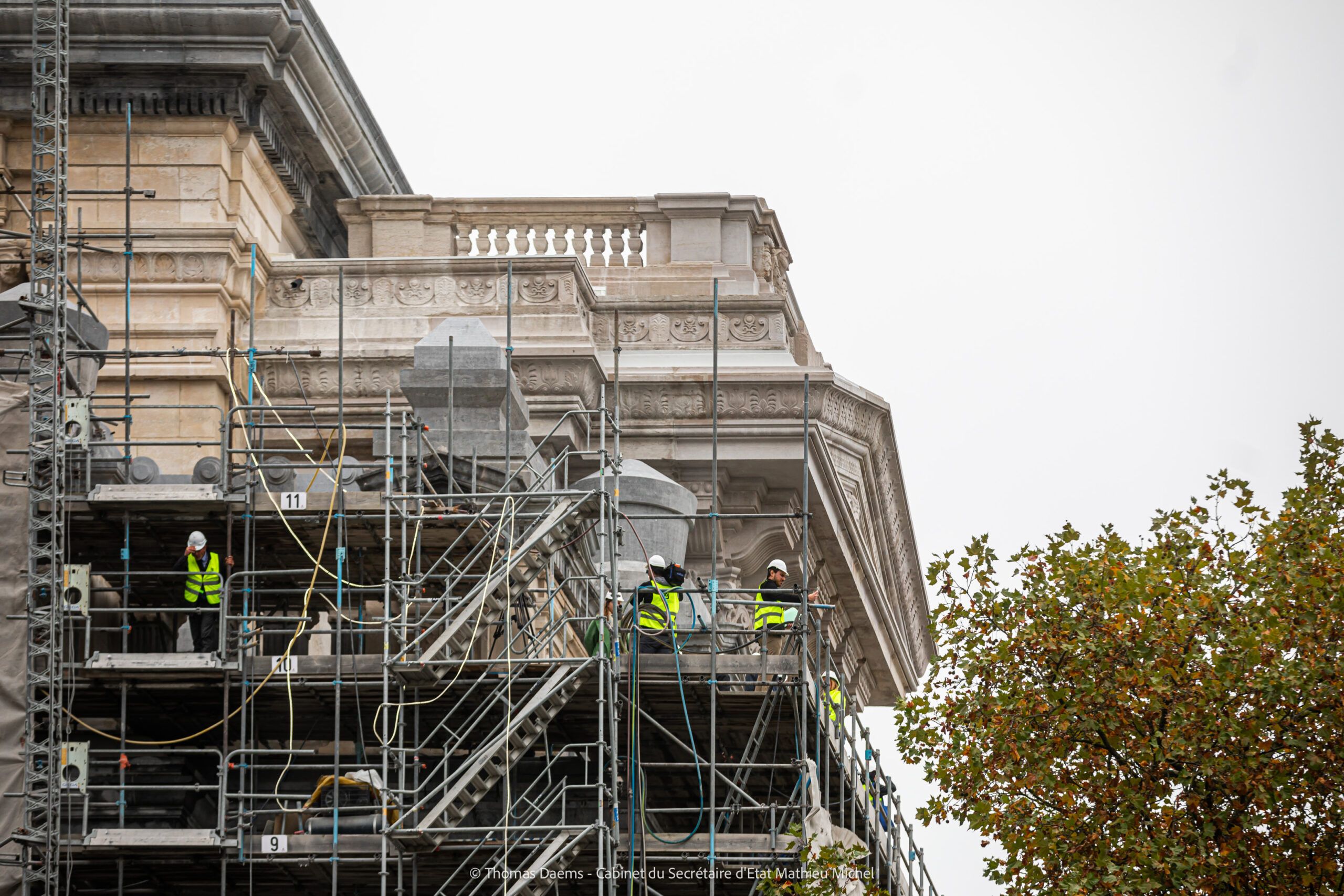 Mathieu Michel, Secrétaire d’État chargé de la Régie des Bâtiments : « Petit à petit, le Palais de Justice se dévoile encore un peu plus: rénové, modernisé et, surtout, débarrassé d’une autre partie de ses échafaudages. Pour moi, ce chantier est le symbole d’un pays qui se respecte enfin et qui respecte son patrimoine. La gestion publique exige rigueur et efficacité. En ce sens, 40 ans d’échafaudages, c’était inacceptable! Je regrette que mes prédécesseurs n’aient pas pris ce chantier à bras le corps plus tôt. On aurait économisé beaucoup de temps, beaucoup d’argent… et beaucoup de moqueries. »